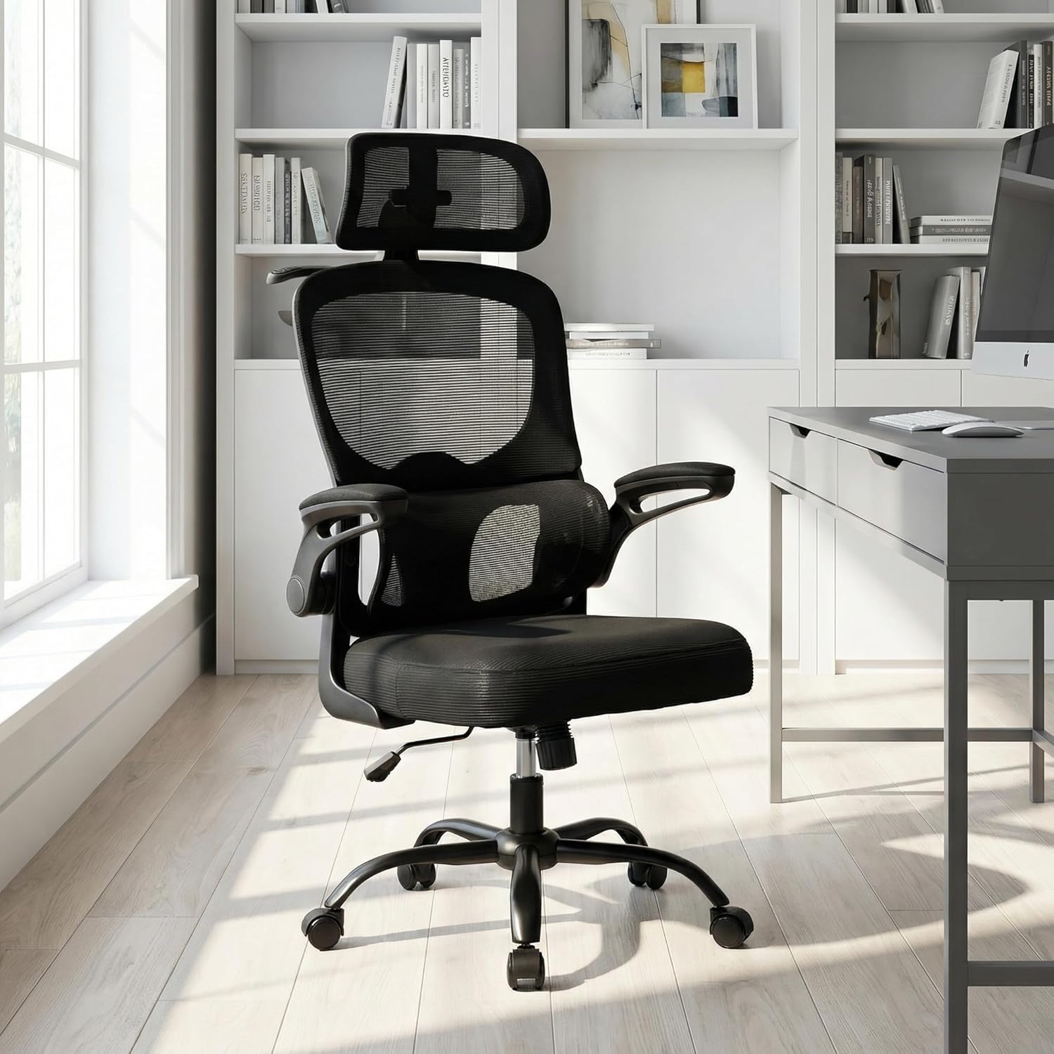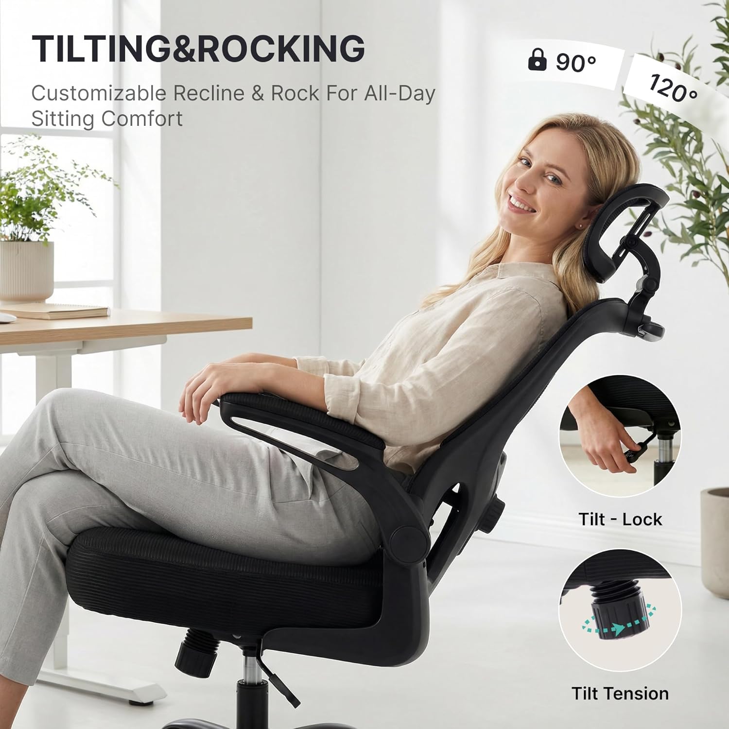 330Lbs Ergonomic Office Chair with 3D Headrest, Home Office Desk Chairs with Adjustable Lumbar Support,Flip-up Armrests, Thickened Cushion – Breathable Mesh Design for Long-time Sitting