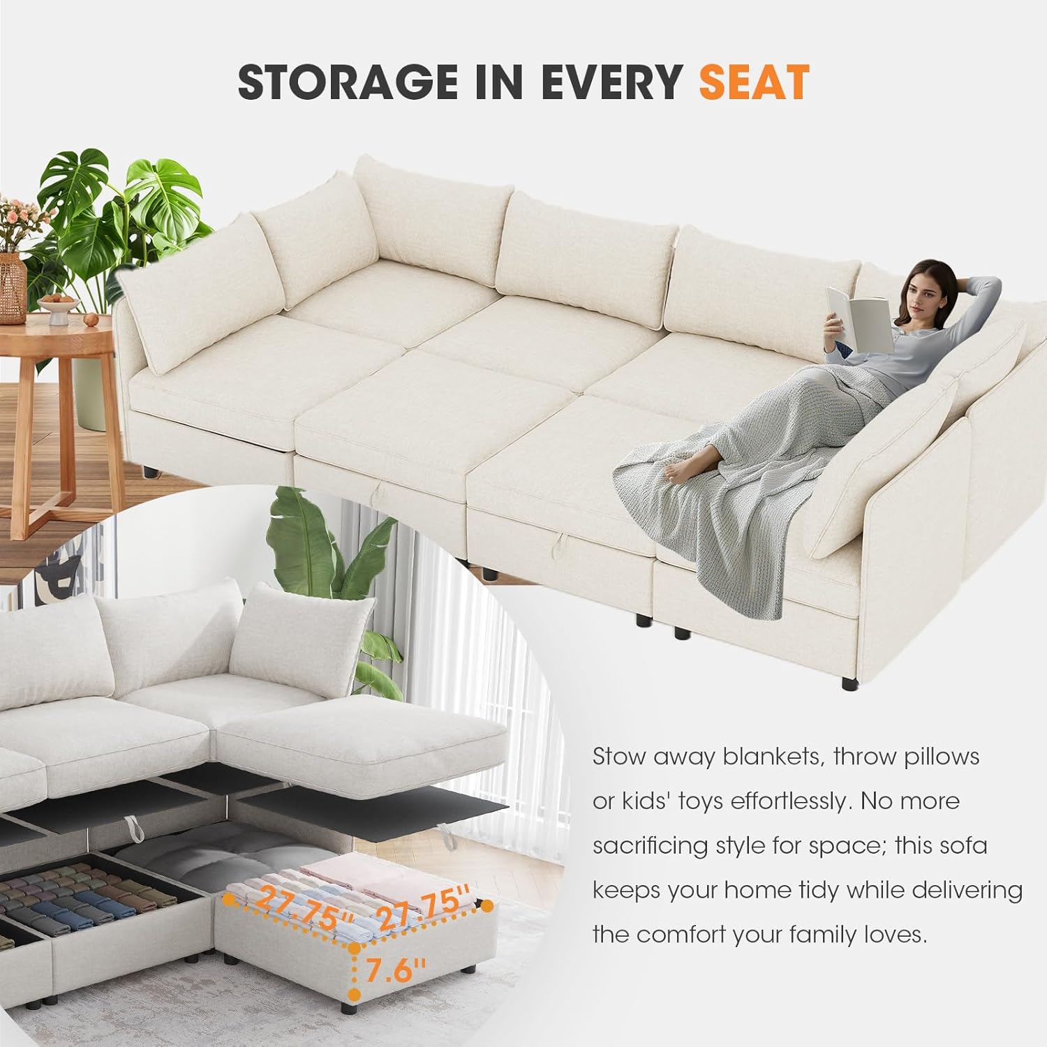 Spacious Hidden Storage & Multi Functionality:Maximize your space with built-in organization! This versatile couch with storage functions as both a sectional couch and an ottoman with storage. Each seat features a deep 7.6″ hidden compartment (27.75″ W x 27.75″ D), perfect for tucking away living essentials. Easily transform this corner couch into a sleeper sectional for guests, making it the ultimate living room set solution that keeps your space clutter free.