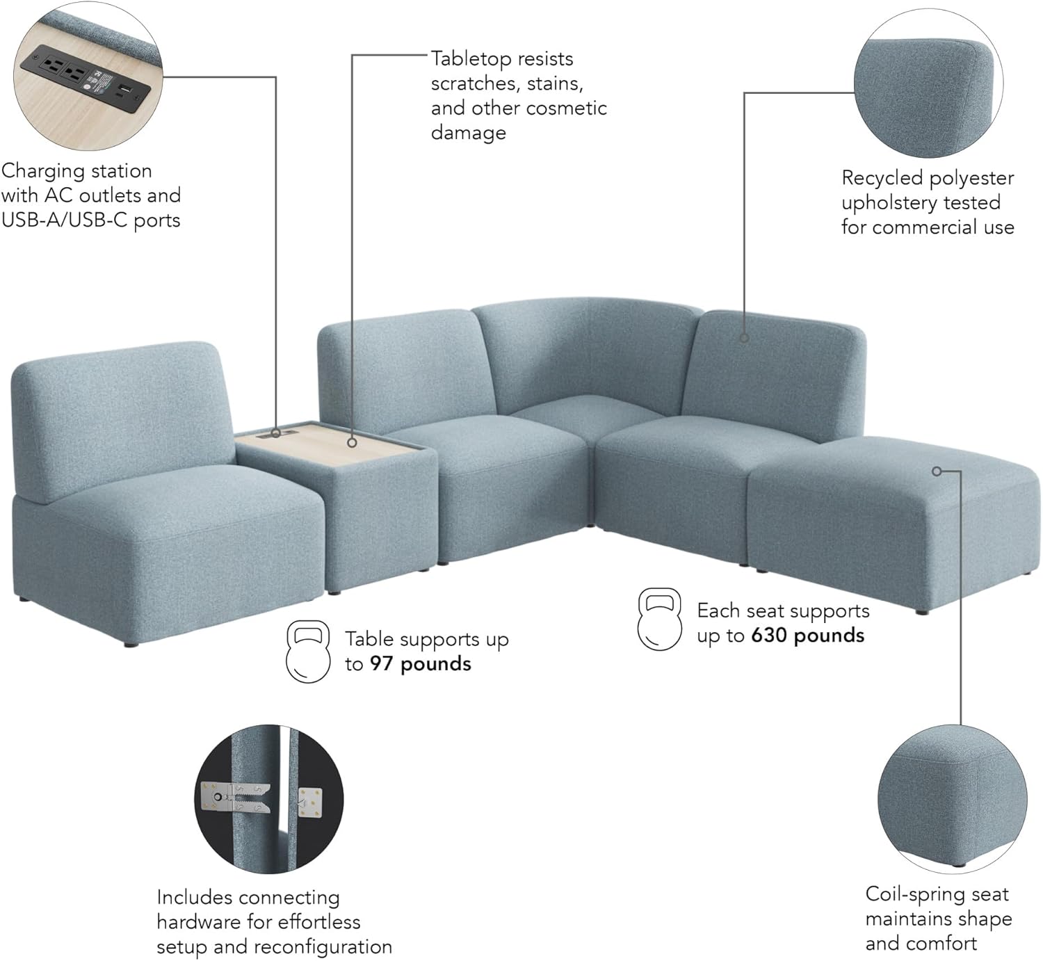 TESTING AND WARRANTY: This modular corner sofa with charging station has been meticulously designed and tested to meet ANSI/BIFMA standards for safety, durability, and performance and is backed by Bush Business Furniture’s Limited Lifetime Warranty.