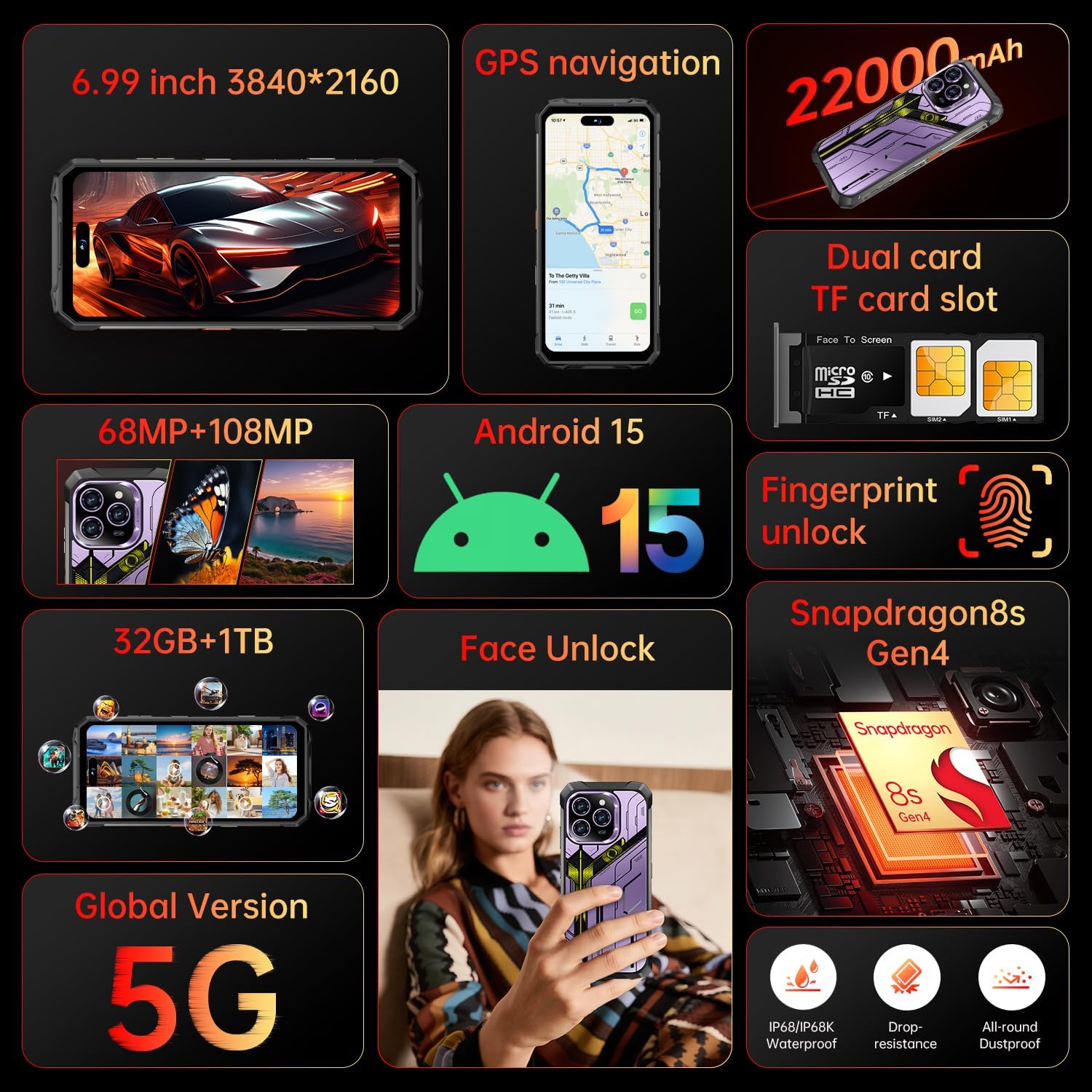 【6.99 HD+ Android 15.0】 This is an Android Cell phone with a large screen,6.99”HD+ Display 1440*3040,This unlocked Android 15.0 16 Ultra phone is equipped with a 108MP main camera and a 68MP front facing camera, And it has facial recognition and Fingerprint button unlock and Quick button for taking photos(Support underwater photography and night vision photography), which effectively protect your privacy,and convenient and efficient operation.