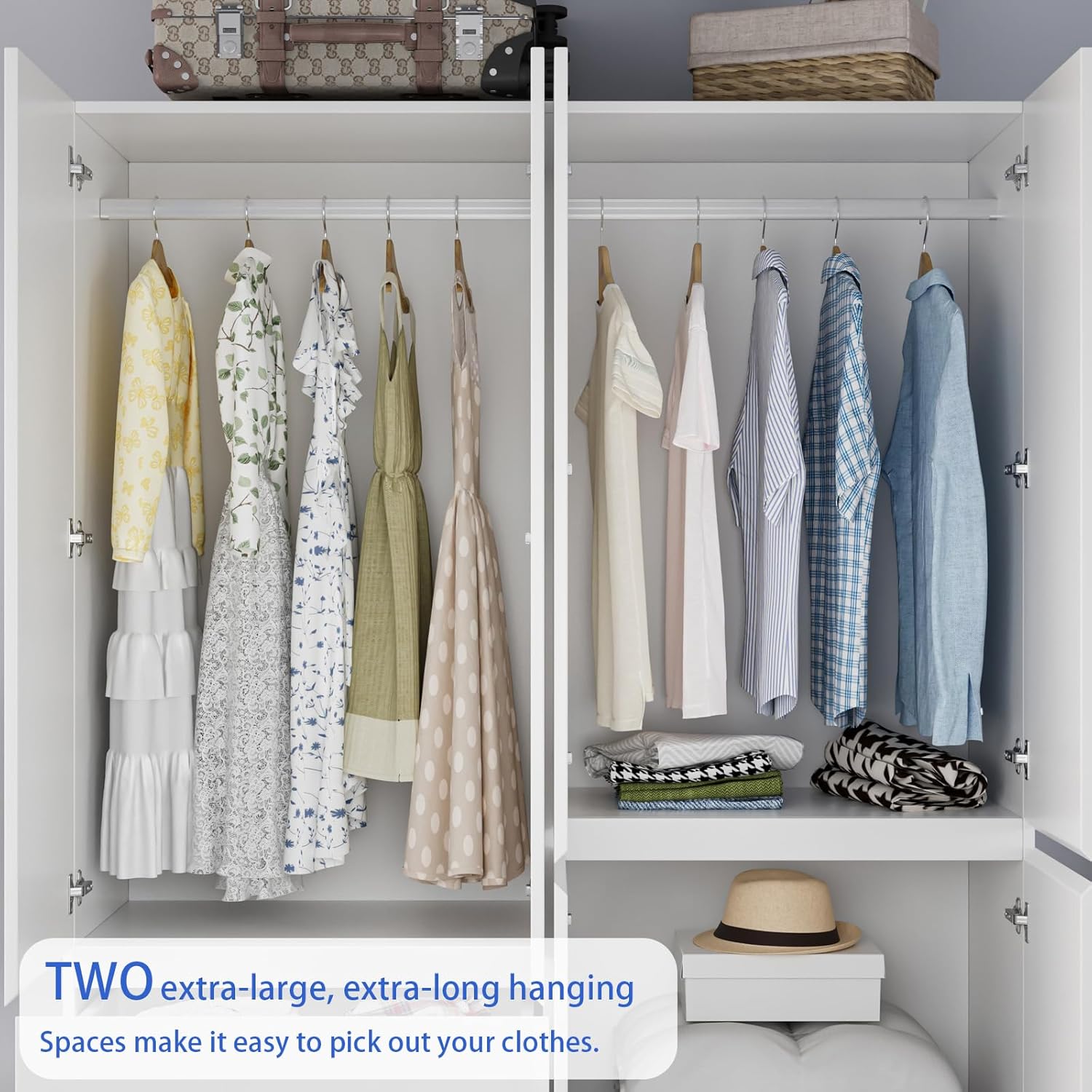 Sturdy and Strong: Our hanging bedroom armoire wardrobe closet with doors is built with high-quality MDF board. The smooth surface is waterproof, scratch-resistant, and easy to clean. The raised base protects against moisture and increases the stability of the closet wardrobe cabinet. Additionally, the quality and metal fittings further enhance the durability of the wardrobe closet.
