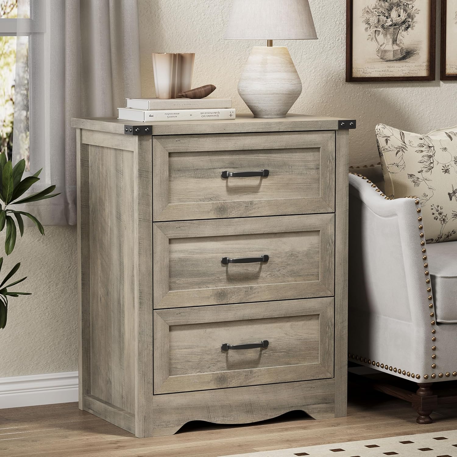 8 reviews for Nightstand with 3 Drawers, 24″ Wide Farmhouse Bedside End Table, Rustic Wood Side Table Night Stand with Mental Handle, Tall Modern Small Dresser Chest of Drawers for Bedroom, Living Room, Dorm, Grey