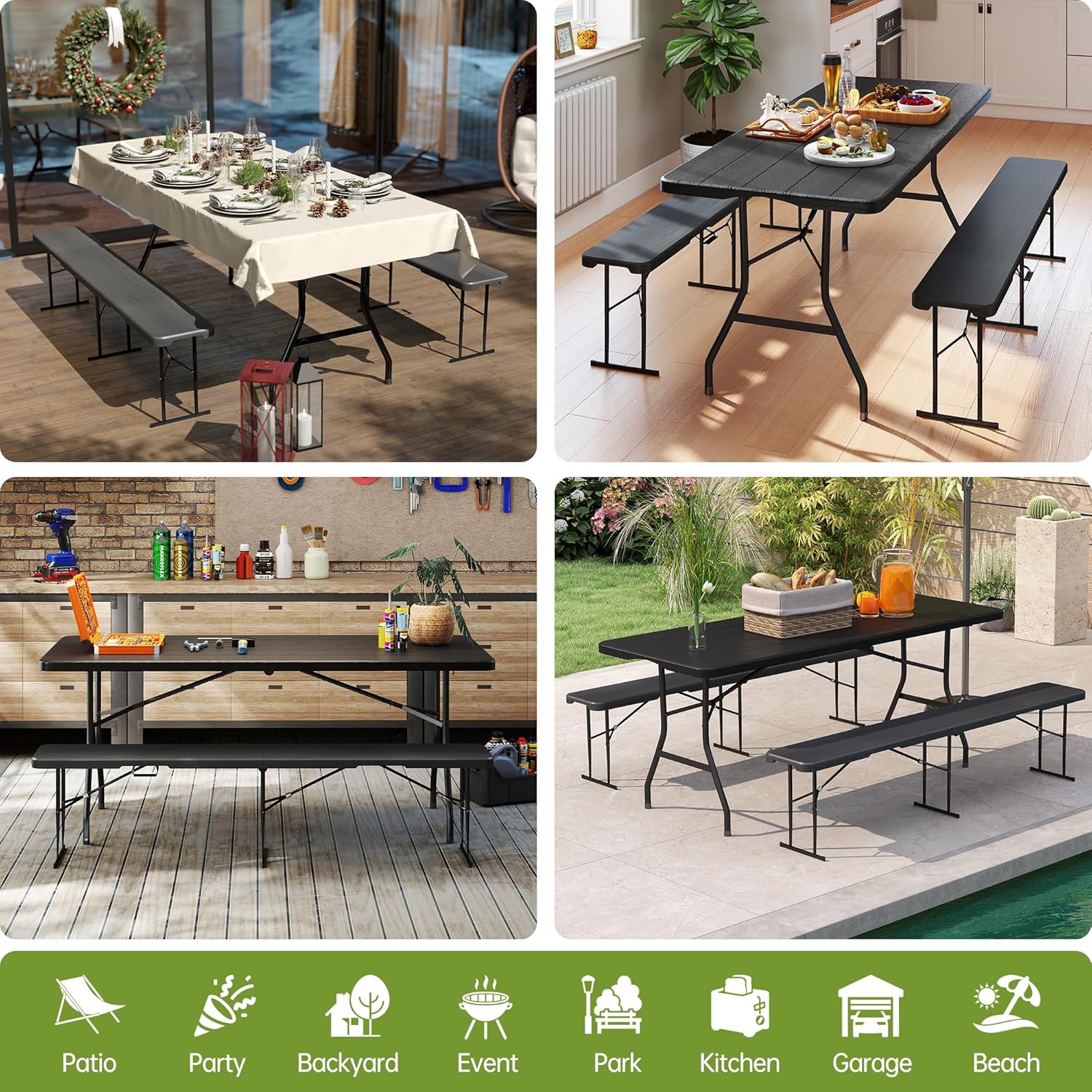 [Premium Durability] Crafted for longevity, this 6ft 3-piece table and bench set features industrial-grade HDPE polymer—a waterproof, high-capacity material engineered for all-weather resilience. The slip-resistant matte surface ensures safety, while a reinforced triangular support system and powder-coated steel frame deliver unparalleled stability. Integrated anti-tipping safety locks and interlocking fixed joints guarantee secure, wobble-free performance even during dynamic use